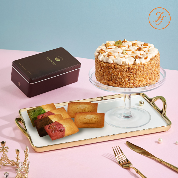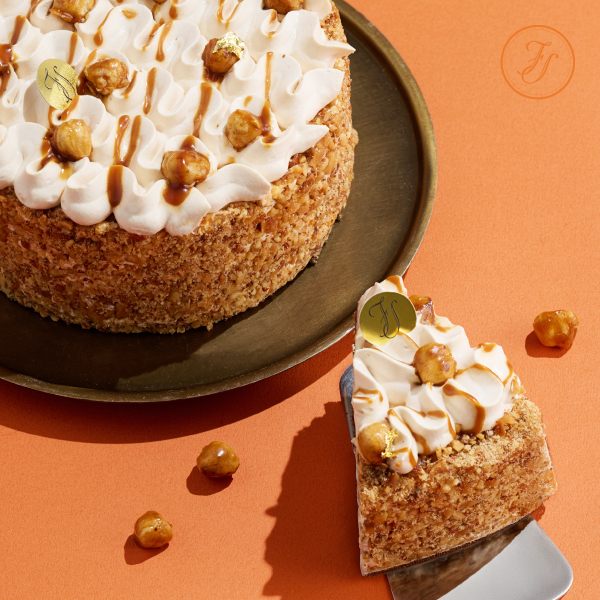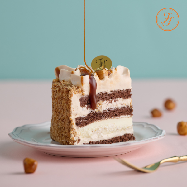 日本北海道十勝奶霜、乳酪香緹(起司鮮奶油)、焦糖醬ᝰ焦糖鮮奶油、整顆焦糖榛果、黃金蛋糕體(巧克力風味)、榛果杏仁碎屑、金箔點綴